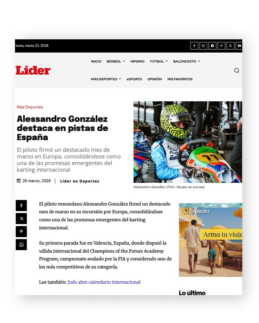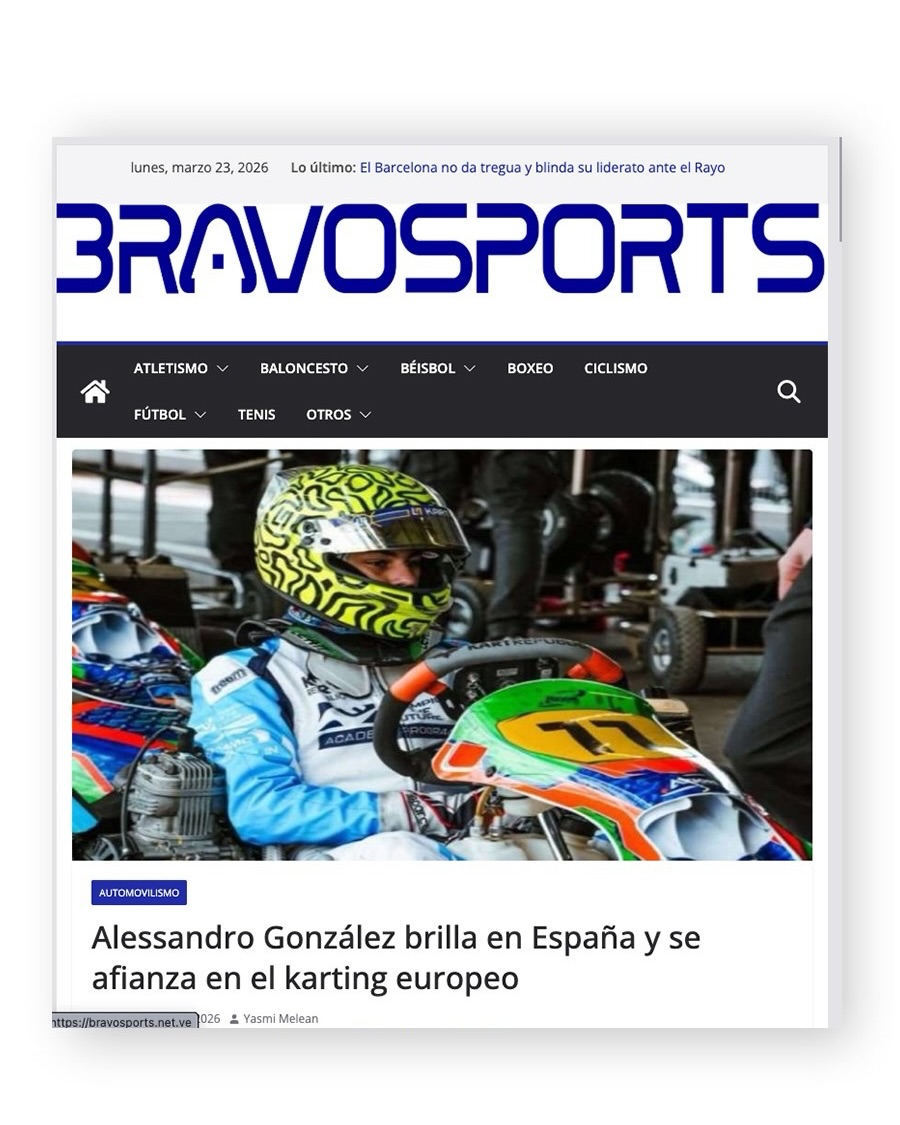 Desde sus primeros pasos en el karting a los 9 años, Alessandro Gonzalez ha demostrado un talento excepcional y una pasión inquebrantable por el deporte. Su carrera ha sido un viaje emocionante lleno de desafíos y victorias. Inició compitiendo en torneos locales en Venezuela, donde rápidamente se destacó por su habilidad y determinación. A medida que ganó experiencia, Alessandro comenzó a participar en competiciones nacionales e internacionales, enfrentándose a algunos de los mejores pilotos jóvenes del mundo. Con cada carrera, ha continuado perfeccionando su técnica y estrategia, consolidándose como una de las promesas más brillantes del karting.
