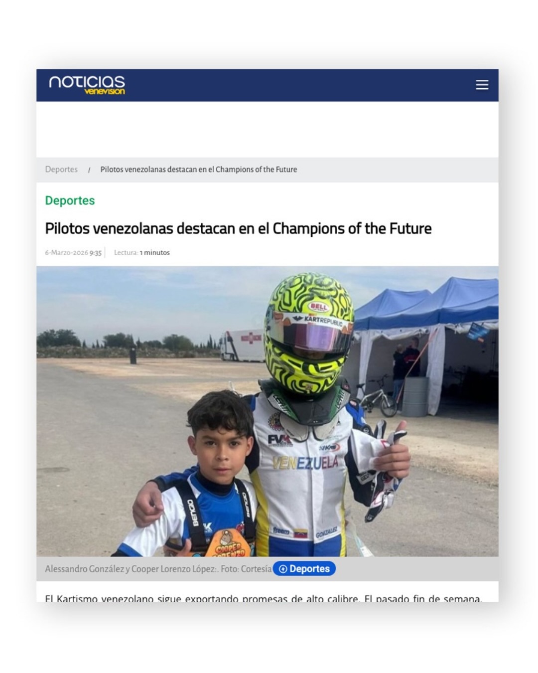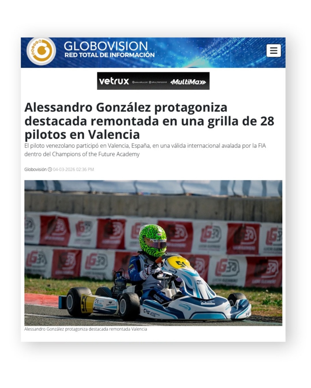 Alessandro González, un talentoso piloto de karting venezolano de 12 años, ha demostrado desde muy joven su pasión y dedicación por el automovilismo. Su amor por el karting comenzó a los 9 años cuando tuvo su primer contacto con un kart y desde entonces, su compromiso y entrega lo han llevado a destacarse en competencias nacionales e internacionales.