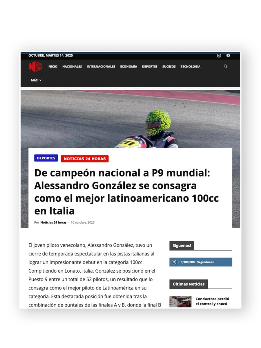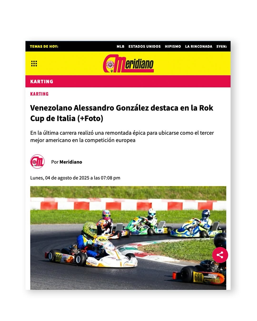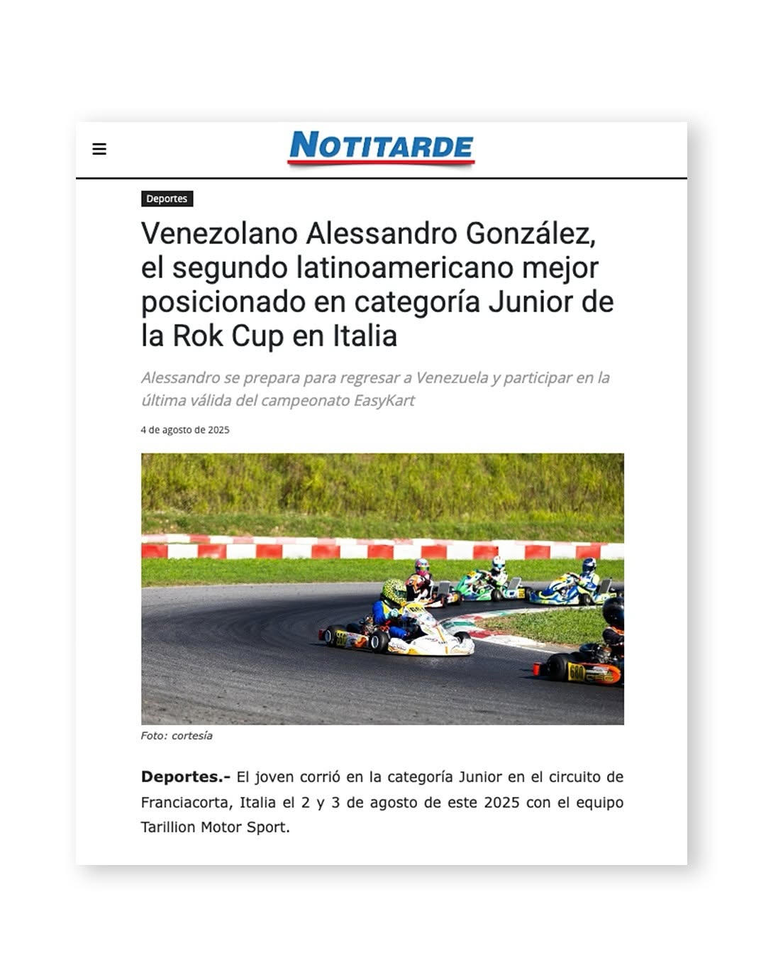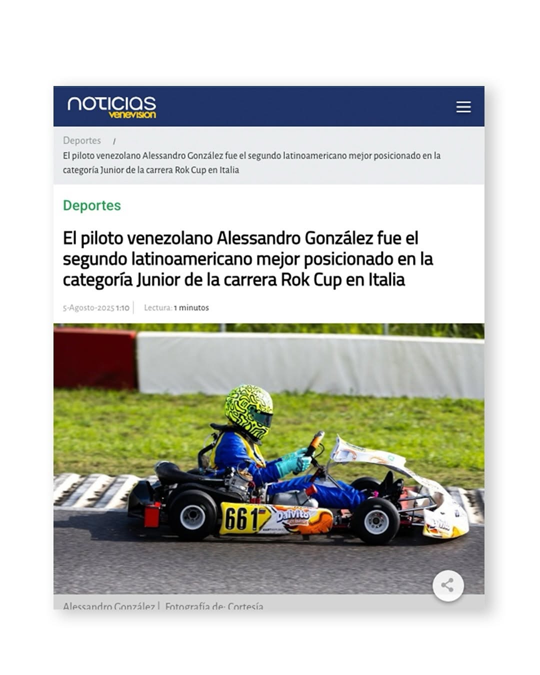 Desde sus primeros pasos en el karting a los 9 años, Alessandro Gonzalez ha demostrado un talento excepcional y una pasión inquebrantable por el deporte. Su carrera ha sido un viaje emocionante lleno de desafíos y victorias. Inició compitiendo en torneos locales en Venezuela, donde rápidamente se destacó por su habilidad y determinación. A medida que ganó experiencia, Alessandro comenzó a participar en competiciones nacionales e internacionales, enfrentándose a algunos de los mejores pilotos jóvenes del mundo. Con cada carrera, ha continuado perfeccionando su técnica y estrategia, consolidándose como una de las promesas más brillantes del karting.