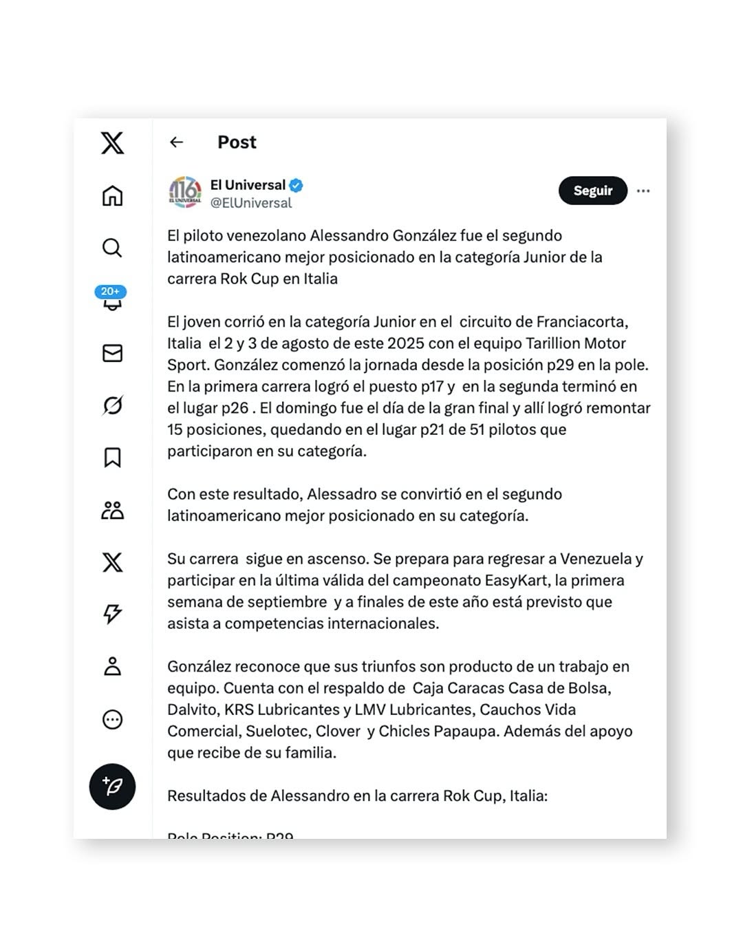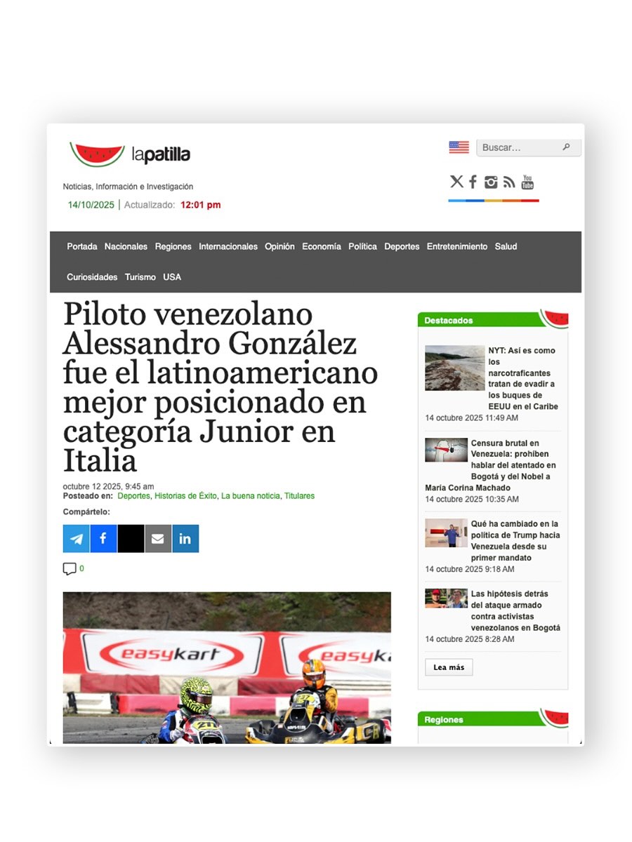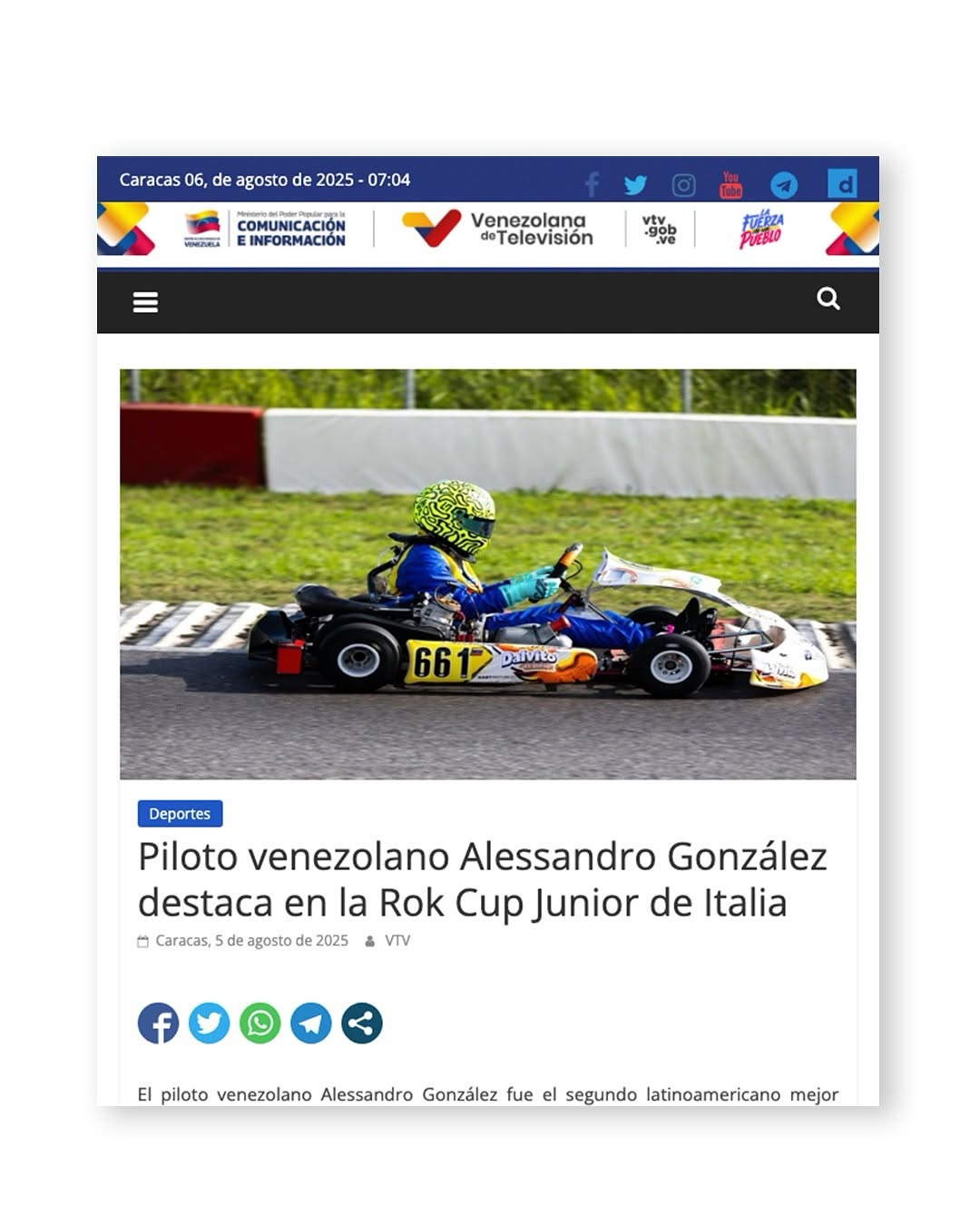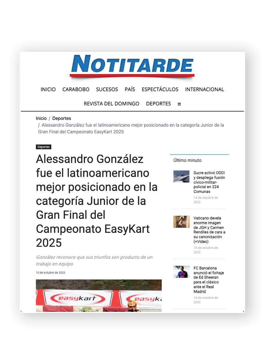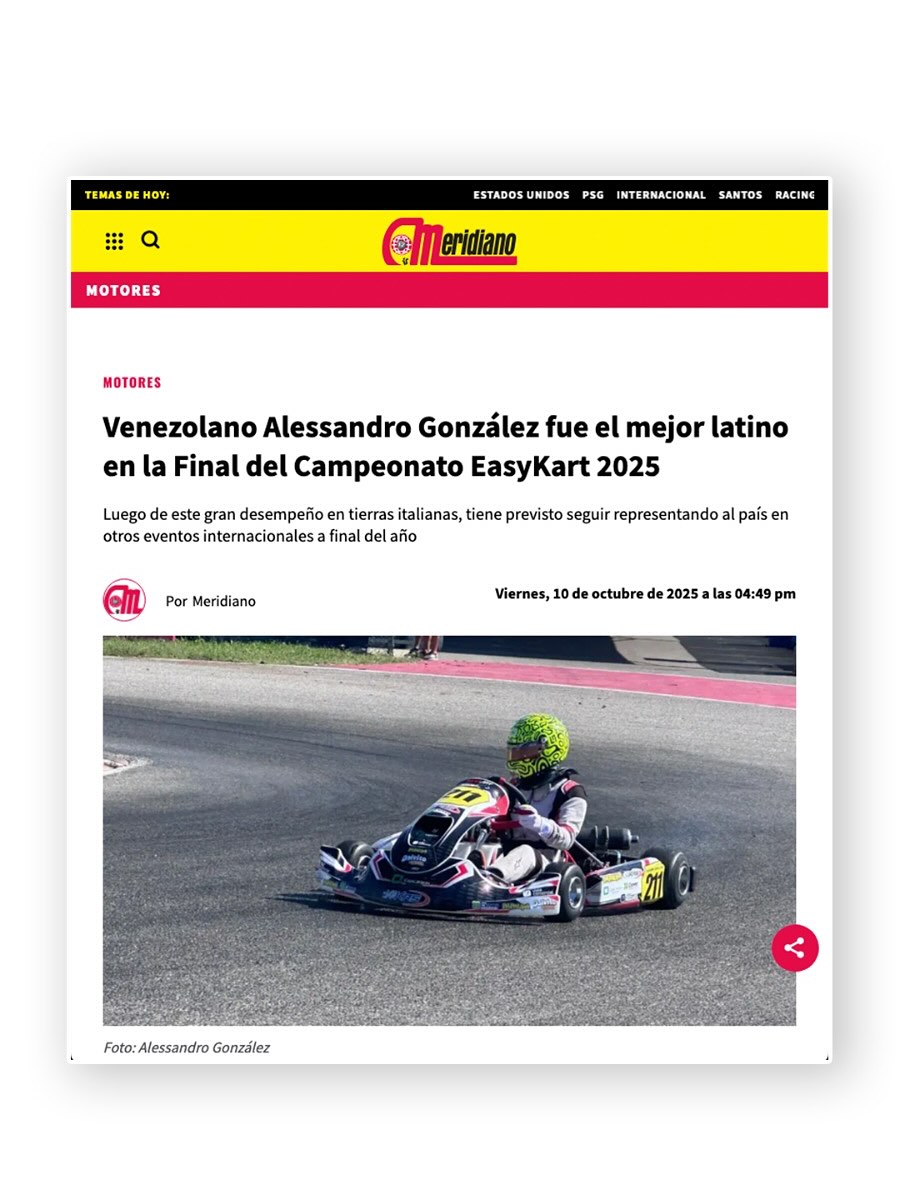 Alessandro González, un talentoso piloto de karting venezolano de 12 años, ha demostrado desde muy joven su pasión y dedicación por el automovilismo. Su amor por el karting comenzó a los 9 años cuando tuvo su primer contacto con un kart y desde entonces, su compromiso y entrega lo han llevado a destacarse en competencias nacionales e internacionales.