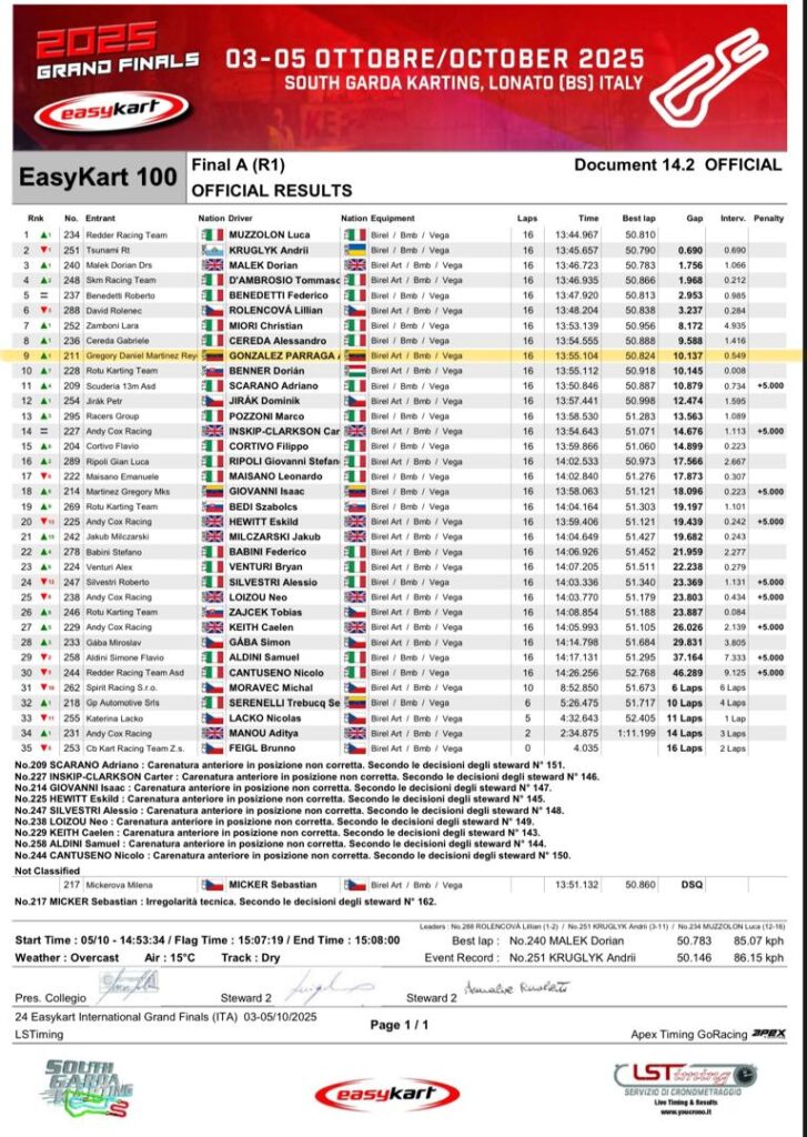 Felicitaciones a mi hijo Alessandro, quien en su primer año en la categoría 100cc logró un resultado increíble en la Gran Final Mundial del Campeonato Easykart 2025, celebrada en Lonato, Italia. De un total de 52 pilotos, logró posicionarme P9 destacándose como el mejor piloto de Latinoamérica. Quiero agradecer especialmente a mi familia, por su apoyo incondicional, y a los patrocinadores, por creer siempre en este sueño. ¡Este logro es de todos! 💪❤️